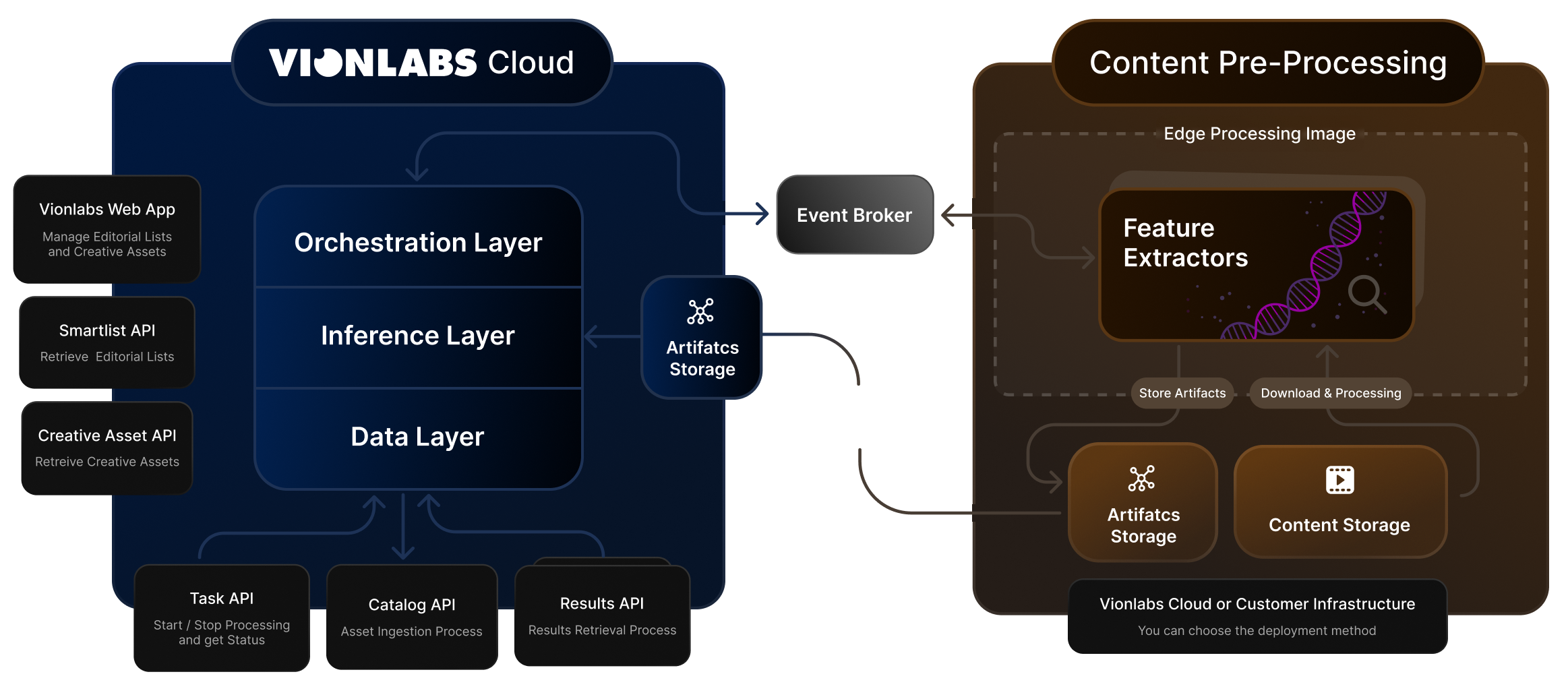 The Vionlabs platform is built on a modular architecture, designed to support different deployment models depending on customer requirements, infrastructure, and security constraints. The system is divided into two main subsystems: